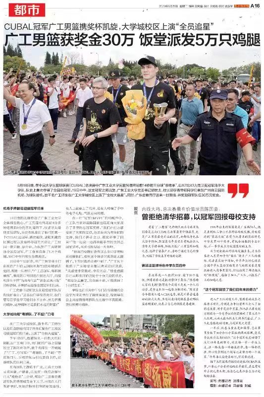 随后,广工男篮将士们带着奖杯回到广工大学城校区,数千名广工师生以及周边院校的同学齐齐汇聚在广工校区迎接冠军们的归来,上演了“全校大追星”。