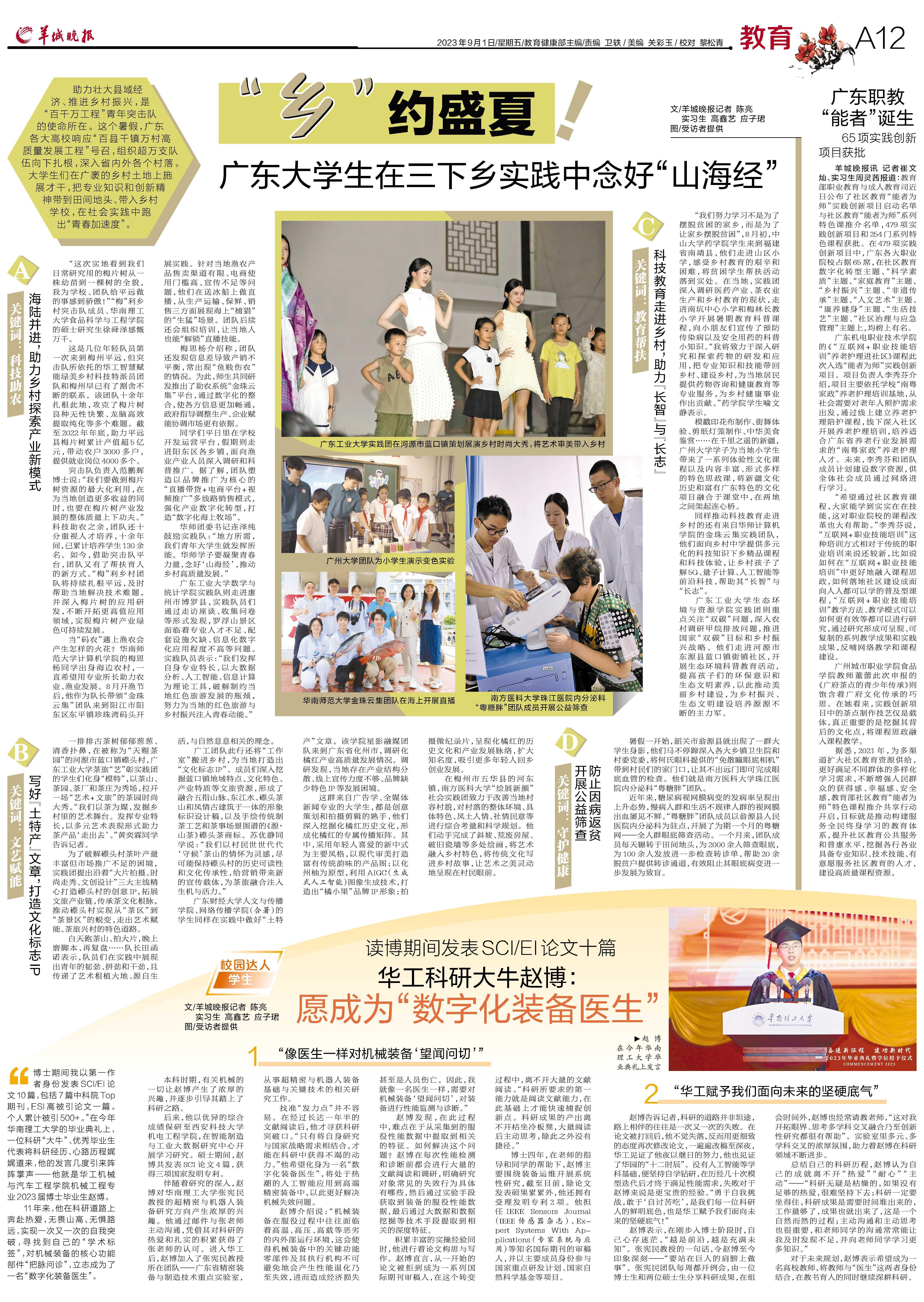 助力壮大县域经济、推进乡村振兴,是“百千万工程”青年突击队的使命所在。这个暑假,广东各大高校响应“百县千镇万村高质量发展工程”号召,组织超万支队伍向下扎根,深入省内外各个村落。大学生们在广袤的乡村土地上施展才干,把专业知识和创新精神带到田间地头、带入乡村学校,在社会实践中跑出“青春加速度”。
