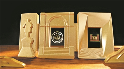 先来看礼盒内的“世纪之门”徽章。徽章通体为金色,用数字“100”的形态汇聚光影。