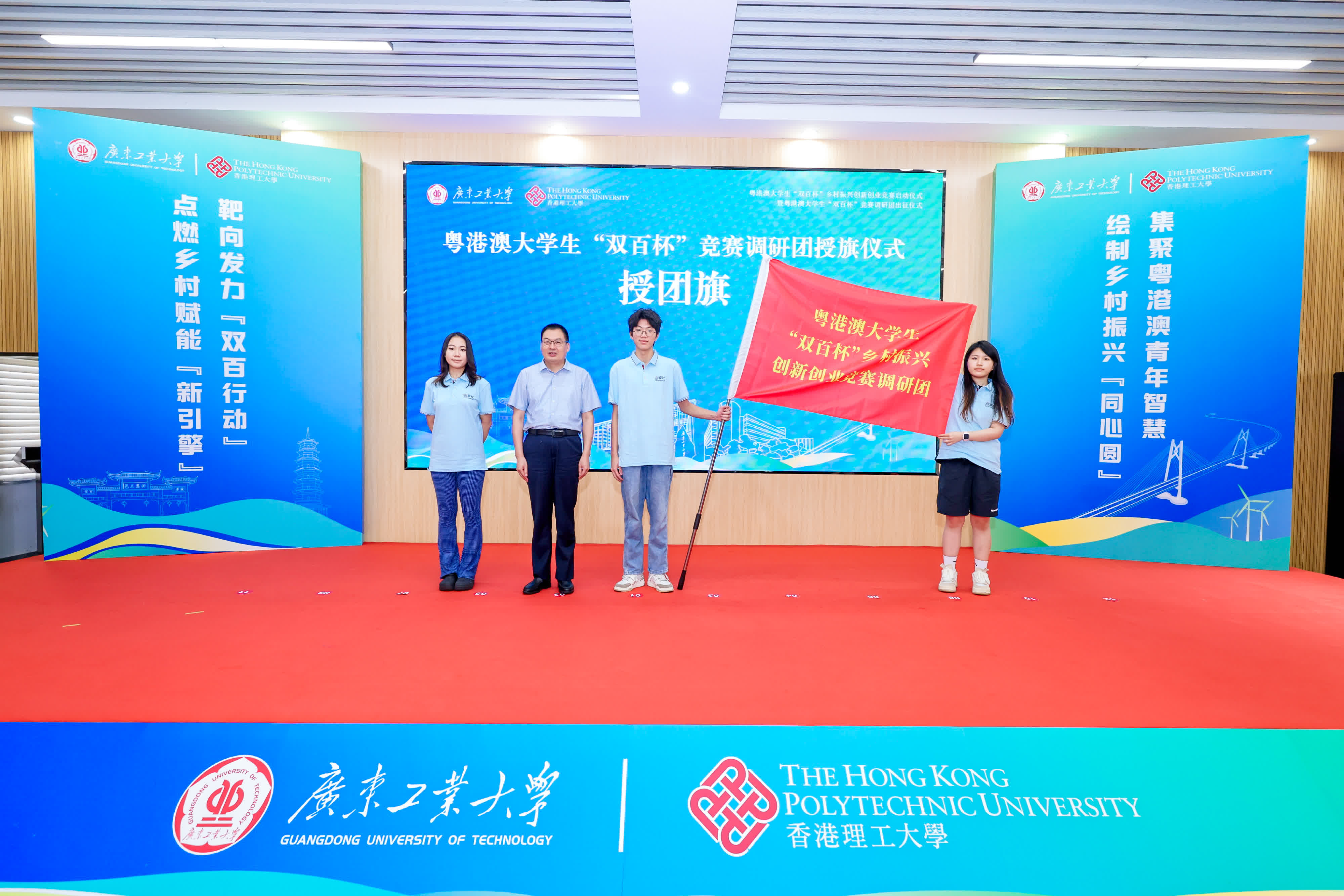 主辦方為粵港澳大學生「雙百杯」競賽調研團授團旗。(受訪者供圖)(香港文匯網記者盧靜怡 廣州報道)粵港澳大學生「雙百杯」鄉村振興創新創業競賽日前在廣州正式啟動。活動由廣東工業大學與香港理工大學主辦,吸引了香港嶺南大學、香港教育大學、澳門城市大學等港澳高校及廣東高校100多名師生參加,首次實現跨境聯合辦賽,粵港澳三地高校共同參與。調研團學生代表、香港嶺南大學王廉同說,期待能通過參加競賽助力鄉村發展,三地青年攜手為鄉村振興貢獻力量。