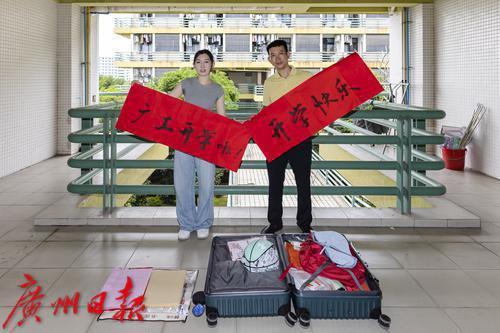 广工2024级新生唐雅琪向记者展示她父亲(右)为自己开学挥毫的毛笔作品。