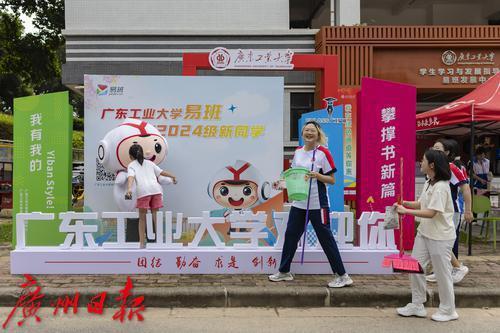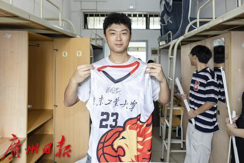 广工2024级新生黄峄达带着明星球员陈国豪的23号签名球衣前来报到。