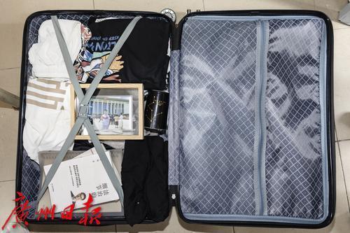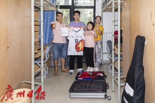 广工2024级新生黄峄达拿着广工男篮“明星”陈国豪签名的球衣在宿舍中与家人合影。