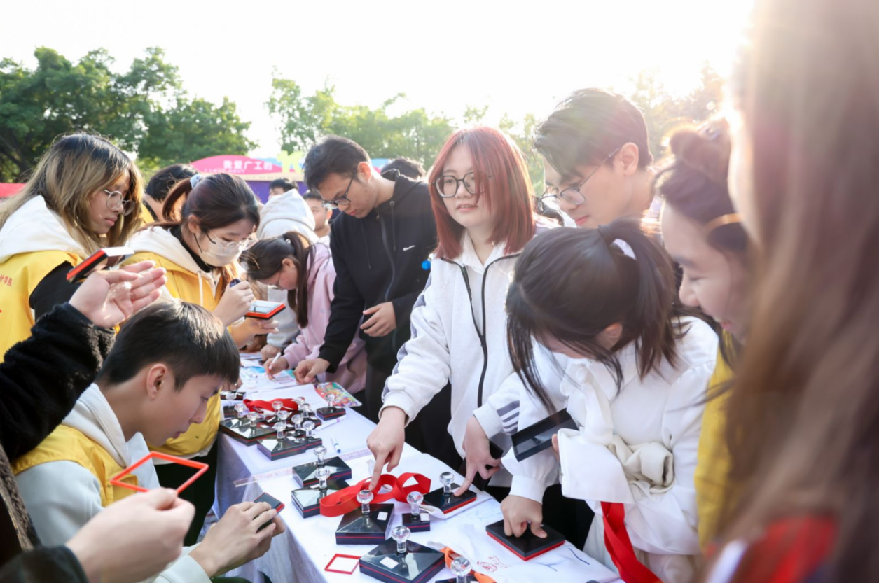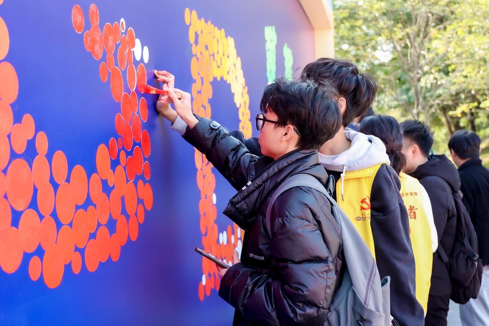 现场还设有五个特色环节:知校·情深叙怀:“我和广工的故事”视频共创;绘校·聚力添彩:“我为GDUT添新彩”彩绘共创;爱校·心心相印:“I ❤ GDUT”文创共创;荣校·光影芳华:“我与广工合个影”照片共创;兴校·攀撑永续:校训主题系列文创产品兑换。广工师生以校训为引,畅谈“我与广工的故事”,讲述“我爱广工的理由”。活动主背景由路过学生和志愿者共创完成,现场还有文创共创环保袋、明信片、卡包、钥匙链等校训主题创意文创派发,各摊位前人潮涌动,同学们用双手创作出独属于广工记忆的青春文创。