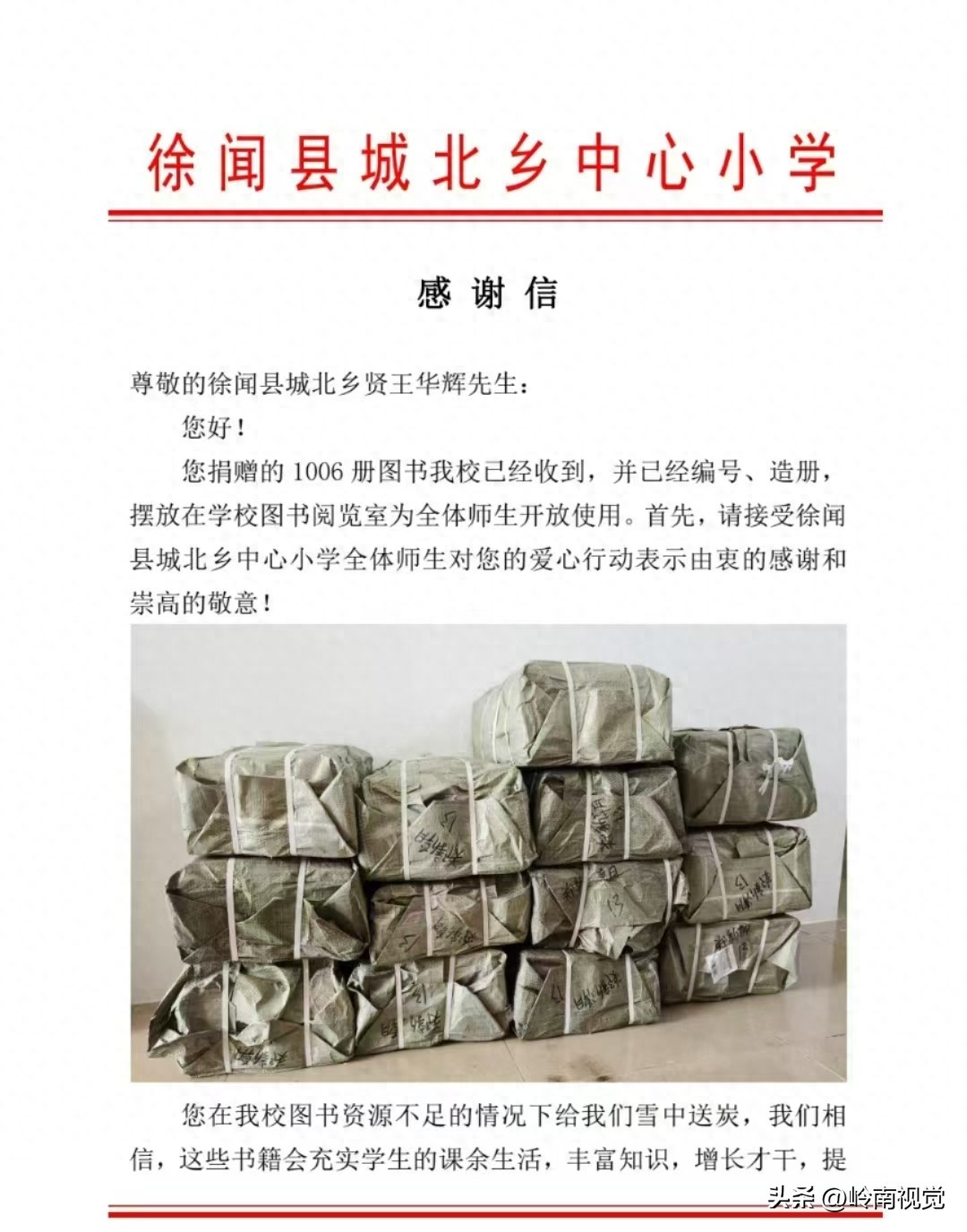 一年前,王华辉老师返乡之际深入乡村小学,发现家乡小学软硬件较为落后,于是决定助力乡村教育。在省教育厅、文旅厅、省高等教育出版社、县教育局、易辉信息、华丰电子及朋友们的倾力相助下,一年多来,捐赠给徐闻城北乡中心小学、那松小学图书30000余元;推动那松小学篮球场翻新,并给那松小学捐赠教学音响设备约20000元;给下桥镇中心小学捐赠教学音响设备约30000元,还计划年前家乡小学粉刷墙体和买点体育器材。王华辉老师表示:“尽管自己能力有限,但不管将来怎样,都会尽力为家乡做点小贡献。希望更多人发挥更大作用,涓滴之力汇聚成磅礴伟力!”。