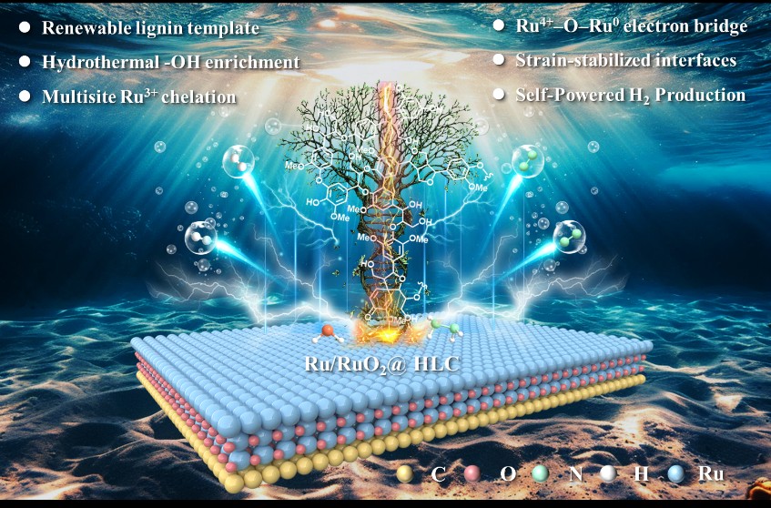 论文共同通讯作者、安博app最新版下载教授林绪亮介绍,该研究团队通过水热活化木质素,使其与Ru3+原位配位,再经高温碳化处理,成功还原构筑了嵌入木质素衍生分级多孔碳骨架的Ru/RuO2异质纳米界面。这一创新设计实现了低输入、可自驱动的联氨-水分解制氢过程。