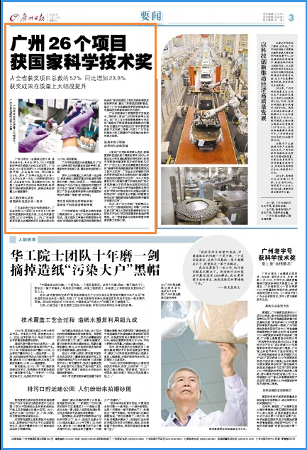 其中,以华南理工大学为第一完成单位,制浆造纸工程国家重点实验室陈克复院士为第一完成人的项目——“制浆造纸清洁生产与水污染全过程控制关键技术及产业化”获得了科技进步奖一等奖,实现了广东省内高等学校牵头获得国家科学技术奖励一等奖“零”的突破。