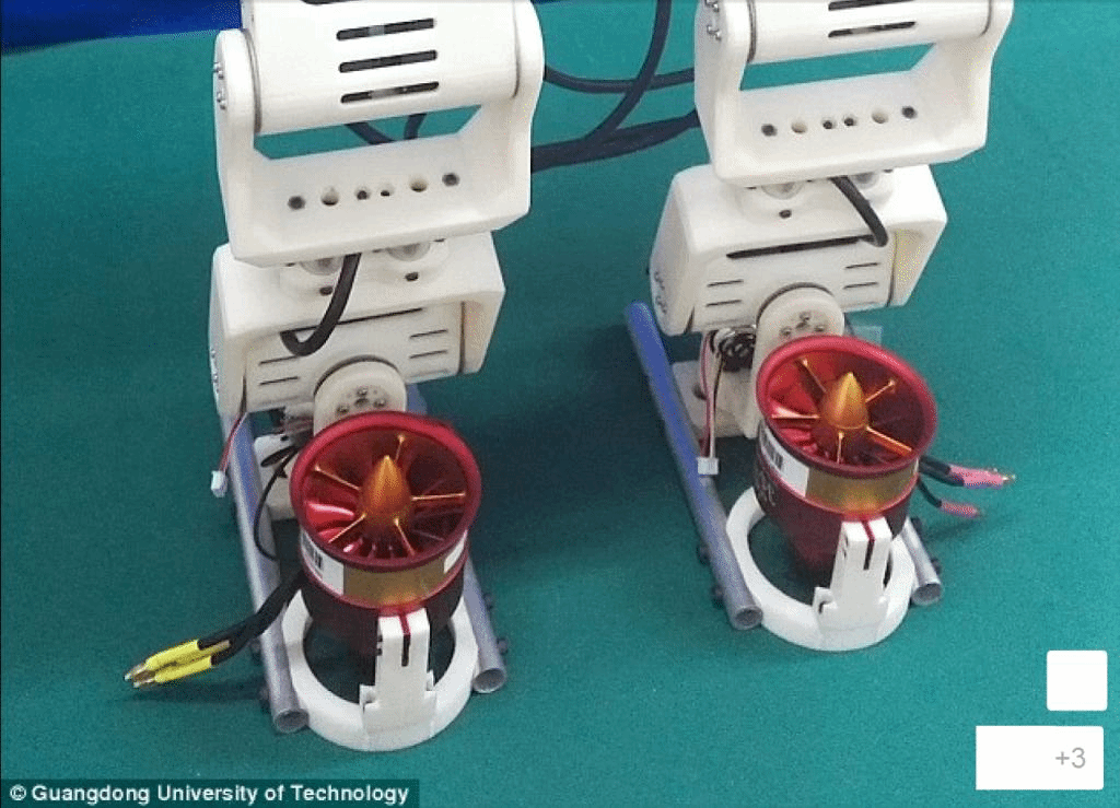 Robotics engineers at Guangdong University of Tech's School of Automation in China strapped two duct fans to the robot's feet which allow it to cross wider distances than it would have been able to previously.