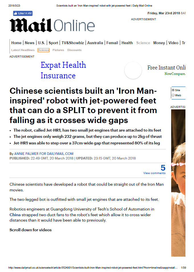报道称,但是,中国制造的这款Jet-HR1机器人不会摔倒,研发者将两个涵道风扇固定在机器人的脚上,喷气引擎可以平衡它的重心,这样它就能够跨越更大的距离。