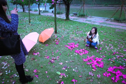 图书馆对面的紫荆花竞相怒放,灿烂了一段心情,芳华了整座校园。雨雾横飞的三月里,走在人工湖北侧的草坪上,几乎沉醉在整片整片的紫荆花海里。很多游客和学生把落花摆成各种字符,唯美程度不输玫瑰花束。