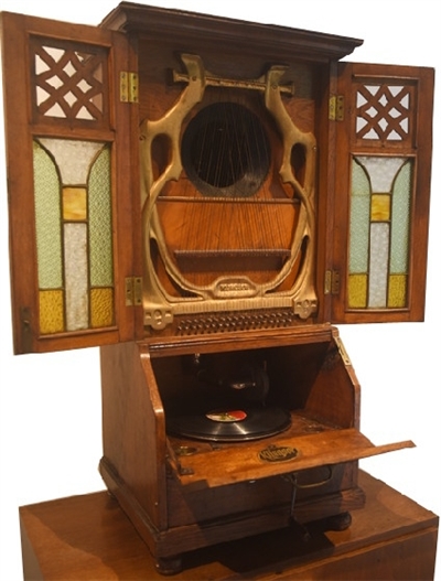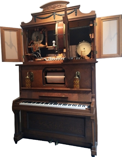 《卷纸自动演奏古董机械钢琴》 Hupfeld公司曾是莱比锡一家很大的音乐设备制造商,这台钢琴通过110V电机来驱动两个大的真空吸风箱。钢琴师在这台钢琴上演奏时,每一个琴键都会触发一个气阀,气阀在冲击到相应的小锤,之后锤击复写纸上的钢琴纸卷,再把留下的痕迹拿去打孔就行了。当纸卷在转动经过自奏钢琴时,钢琴内部会有一股气流,吹向纸卷的孔洞,气流穿过孔洞后,就触发了相应的气阀,气阀再驱动安装在键盘底部的电磁线圈,电磁线圈作为动力部件,再推动钢琴的榔头,去敲击琴弦来发出乐声。 |