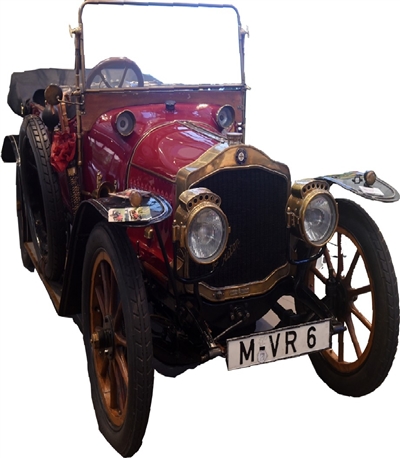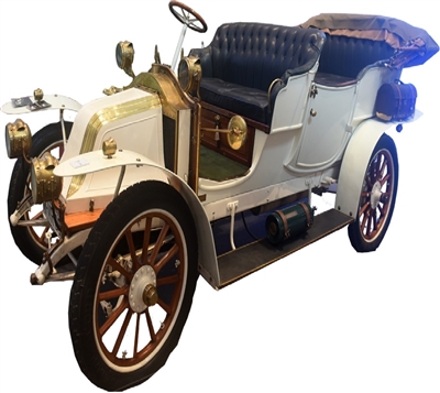 《雷诺老牌赛车》 曾属比利时布鲁塞尔汽车博物馆,于1985年因博物馆翻修,被莱德先生拍得。自重1100千克,5人座,尽管比当今汽车车身短,但后排宽松;拥有一个两缸汽油发动机,马力7PS,若载1-2人,在平坦路面且不开敞篷的情况下,最高时速可达50-60千米/小时。防滑的橡胶轮胎被固定在轮毂的钢圈上,轮毂的内部为木质结构,类似过去的马车轮。铜制车灯与燃气系统相连接,当夜间行驶时,车灯的前盖需要打开,手动点燃车灯。在德国,莱德先生为它拿到了除高速路以外的行驶许可。 |
