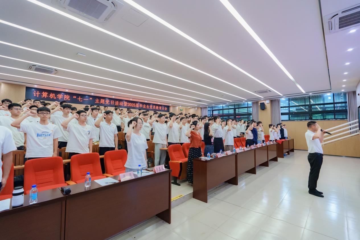 为深入学习贯彻习近平新时代中国特色社会主义思想,扎实推进深入贯彻中央八项规定精神学习教育,全面贯彻落实习近平总书记关于加强党的作风建设的重要论述,进一步强化全体党员责任担当意识,激励全体党员永远跟党走、建功新时代。在建党104周年即将到来之际,计算机学院党委于6月24日下午在工学一号馆学术报告厅举行“七一”主题党日活动暨2025届毕业生党员教育大会。学校纪委办公室主任谭娅、学院党委书记杨文新、党委副书记胡静、师生党支部书记代表、辅导员、2025届全体毕业生党员和2025年上半年新发展党员参加本次大会。大会由胡静主持。