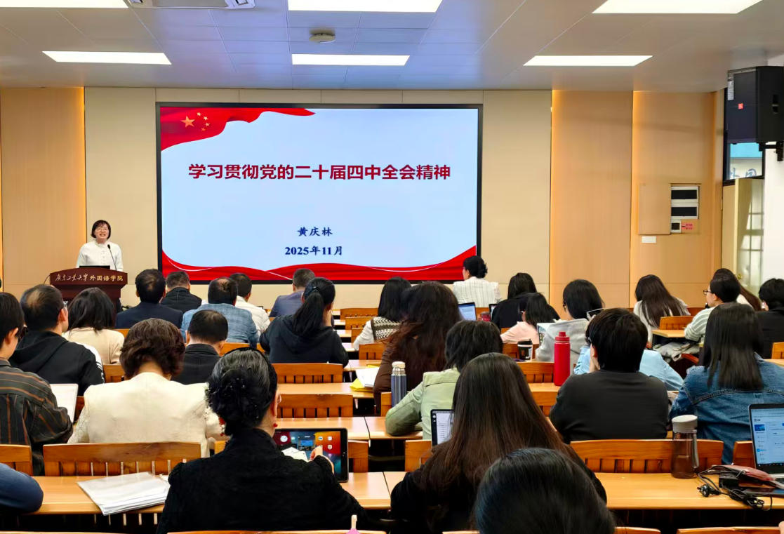 为深入学习贯彻党的二十届四中全会精神,11月25日,外国语学院党委召开党的二十届四中全会精神专题学习会,特邀学校马克思主义学院黄庆林教授作专题辅导报告。学院党委书记刘伟主持,全体职工参加学习。
