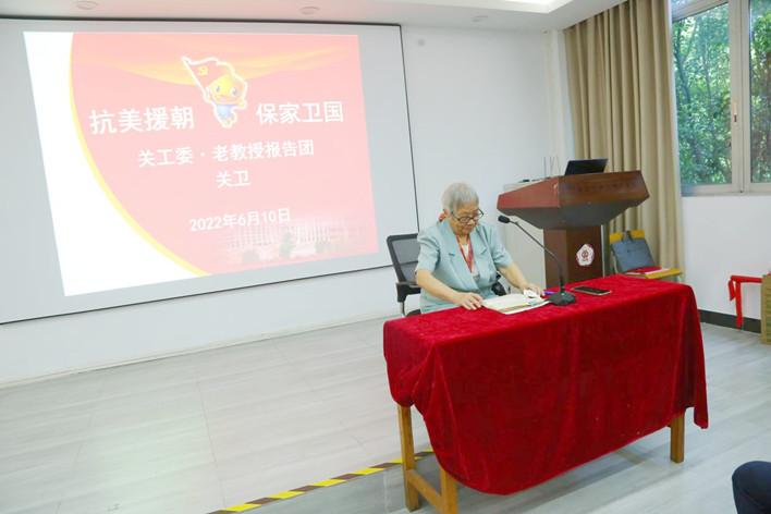 关卫1933年出生于佛山南海,在上海长大。解放战争中隶属于中国人民解放军第三野战军第九兵团。抗美援朝战争爆发后她作为第一批中国人民志愿军战士奔赴朝鲜战场,参加了战况极其激烈的长津湖战役,荣立三等功两次。上世纪80年代初任教于安博app最新版下载社科部。她饱含感情地讲述了自己在抗美援朝战争中的经历。在党的培养和领导下,当时只有17岁的她在朝鲜战场克服了重重困难,坚决把本职工作做好。在部队中,共产党员总是处处做表率。在后勤补给困难的时候,共产党员带头让出自己的一份口粮,让年轻的小战士先吃。在战斗间隙,共产党员利用休息时间带领战士们学文化。在战斗中,她亲眼目睹身边的战友在共产党员的带领下发起一次又一次冲锋。在最艰难的时刻,都是共产党员率先站出来参加突击战斗。为了党和人民的利益,她身边有很多优秀的共产党员献出了宝贵的生命。说到动情处,关卫哽咽了,眼里闪烁着晶莹的泪花。最后,关卫对同学们提出三点期望:一是要坚定理想信念,牢记党的初心使命;二是要涵养家国情怀,勇担时代责任;三是要有不惧艰难勇向前、顽强拼搏敢争先的勇气。